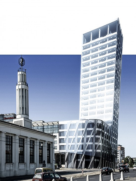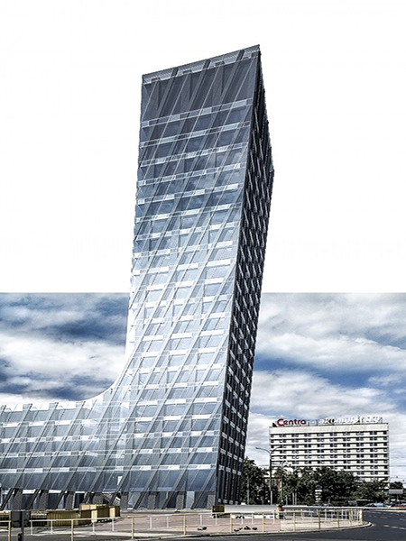 Projektowany budynek składa się z dwóch części spiętych „wstęgą” wspólnej fasady, która od strony południowej stanowi kontynuację pierzei, od strony południowo-wschodniej zawija się miękkim narożnikiem i od strony wschodniej pnie w górę wspinając na ścianę wieży. Niższa część nawiązuje wysokością do sąsiedniego budynku hotelu Sheraton, wyższa część to 23-kondygnacyjna wieża. Miedzy nimi znajduje się atrium, przez które przechodzą kładki spinające obie części budynku. Parter od strony południowej i wschodniej obiega dwukondygnacyjny podcień, który łączy się z przestrzenią atrium i przestrzenią podcienia sąsiedniego budynku. Przez atrium przebiegają dwa trakty komunikacyjne. Jeden z nich znajduje się na osi wejścia do budynku drukarni Concordia, drugi znajduje się na osi wejścia do budynku Międzynarodowych Targów Poznańskich. Przestrzeń pomiędzy projektowanym budynkiem, a istniejącym budynkiem drukarni „Concordia” zagospodarowana jest w formie placu z ciągiem pieszo-jezdnym. W poziomie posadzki parteru projektowane są tafle wody przenikające do wnętrza budynku.