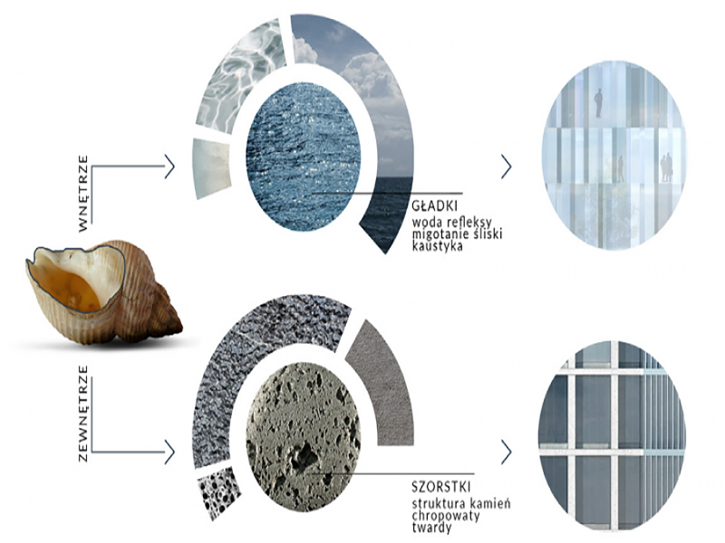 Zaprojektowana zabudowa stanowi zespół trzech w pełni niezależnych funkcjonalnie obiektów. Charakter zewnętrznych i wewnętrznych elewacji jest inny. Inspiracją dla budynku, a raczej całego zespołu jest muszla, ze swoją chropowatą powierzchnią zewnętrzną i gładkim opalizującym wnętrzem. Ostre narożniki podkreślają i precyzyjnie definiują miejsce zmiany charakteru elewacji.