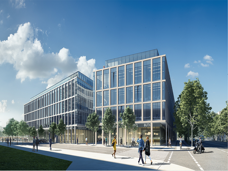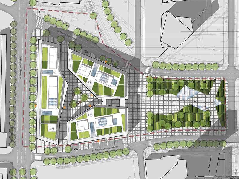 Zespół budynków wypełnia cały kwartał zabudowy. Zaprojektowaliśmy zespół o czterech frontach, jednakową rangę i charakter mają wszystkie elewacje zewnętrzne. Elewacja wschodnia i zachodnia pokrywa się z obowiązującą linią zabudowy pierzejowej, wyznaczonej przez miejscowy plan zagospodarowania przestrzennego. Narożniki budynku zgodnie z zapisami planu zostały lokalnie nadwieszone nad „nieprzekraczalną linią zabudowy na poziomie parteru”.