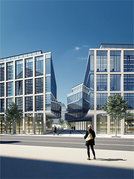 Elewacje zewnętrzne wykorzystują dwa elementy formalne: betonową ramę dającą elewacji tektonikę i światłocień i szkło. Dodatkowo kształt parteru wraz z rytmem słupów mają za zadanie kierować pieszych na wewnętrzy dziedziniec. Wszystkie elewacje zewnętrzne zostały zaprojektowane i skomponowane jako wspólny zespół budynków.