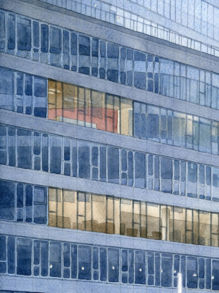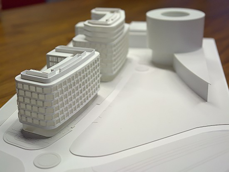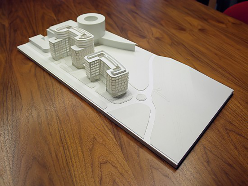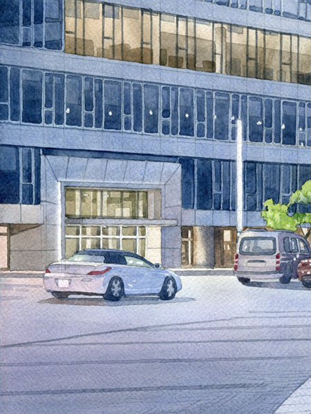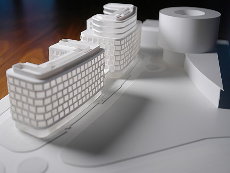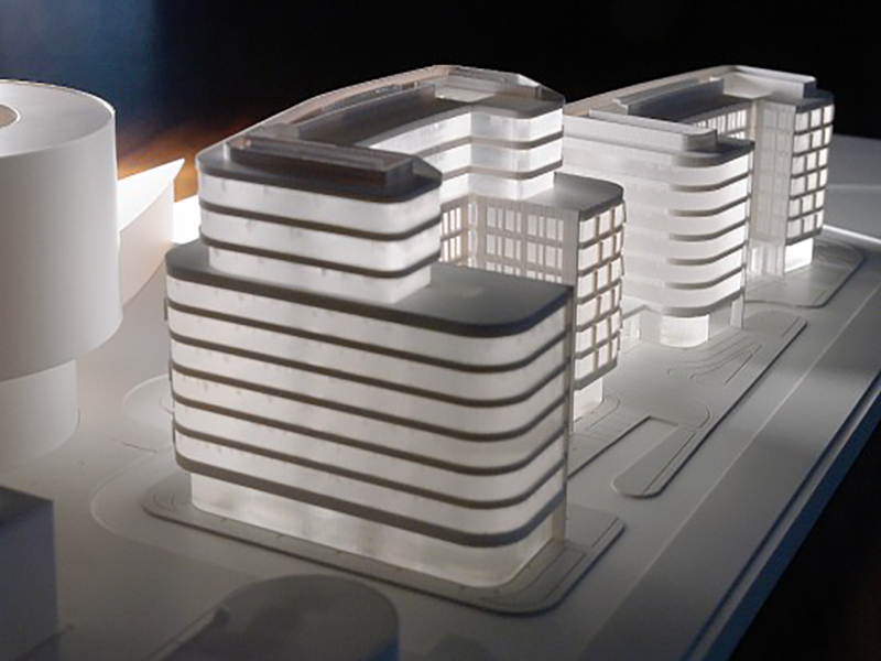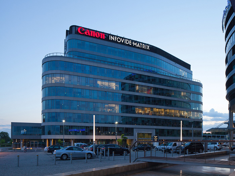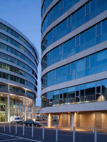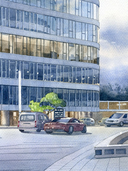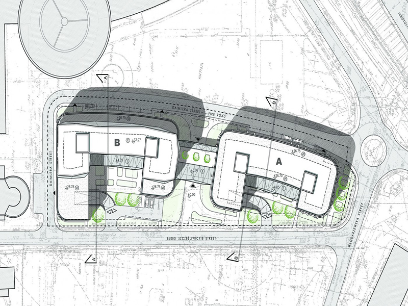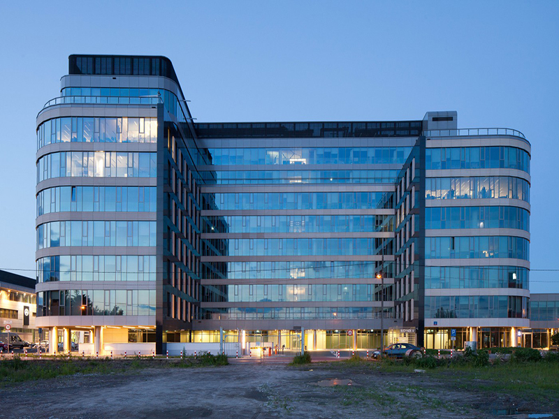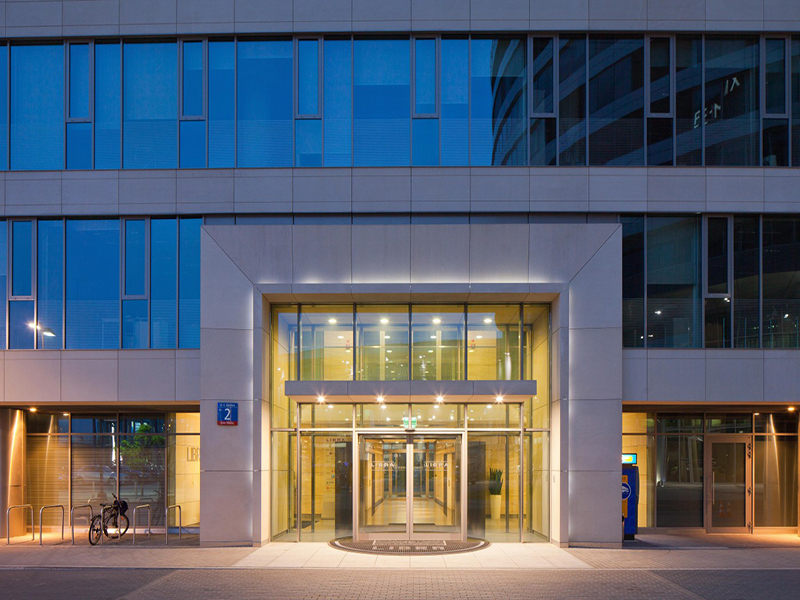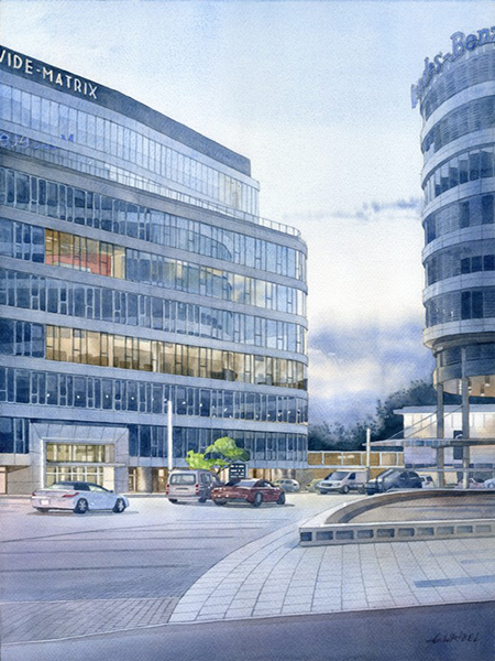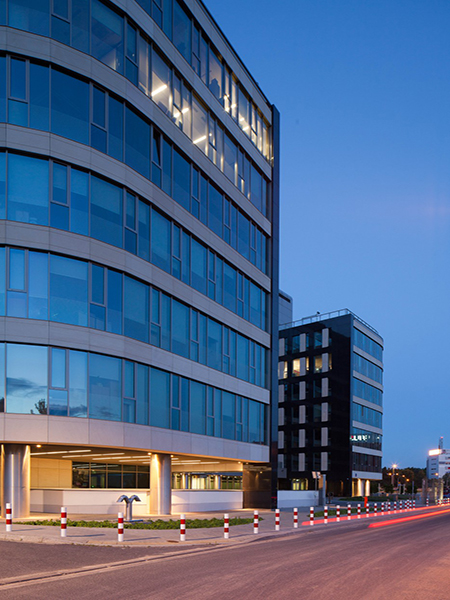 Zespół dwóch budynków biurowych (siedmiokondygnacyjnych z odpowiednio jedną i dwoma cofniętymi ostatnimi kondygnacjami) w kształcie litery „C”, połączonych dwukondygnacyjnym łącznikiem. Kształtowanie bryły polega na obudowaniu miękką, przeszkloną formą statecznych prostokątnych dziedzińców otwierających się na zachód. Miękka linia zewnętrznych elewacji podkreślona przez pasy międzyokienne tworzy od strony wschodniej płynny łuk pierzei ul. Daimlera, korespondując z formą sąsiedniego budynku Mercedesa.