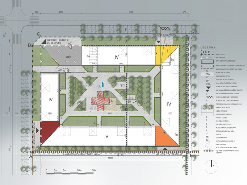 Otwarcie „do wewnątrz” stwarza poczucie bezpieczeństwa dla mieszkańców, które jest niezwykle istotnym elementem przyjaznego miejsca zamieszkiwania. Mały placyk wejściowy przy narożniku ulicy Korczaka, stanowi zapraszający urbanistyczny akcent, swoisty atraktor wiążący przestrzeń nowoprojektowanego założenia z istniejącym układem urbanistycznym. Jednocześnie jest to swoista brama wejściowa do strefy pieszej osiedla, która jest bocznym uzupełniającym ciągiem komunikacyjnym i kieruje ruch pieszy w kierunku dawnego przyszpitalnego parku. Plac główny stanowi główną przestrzeń publiczną założenia. Mimo iż przeprowadzony jest przez niego ruch kołowy, wyniesione skrzyżowanie a także uspokojony ruch zniesione są na obrzeża placu uwalniając przestrzeń dla pieszych. Na placu umiejscowiona lokalna dominanta w formie zegara, bądź obelisku.