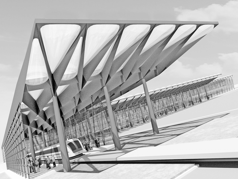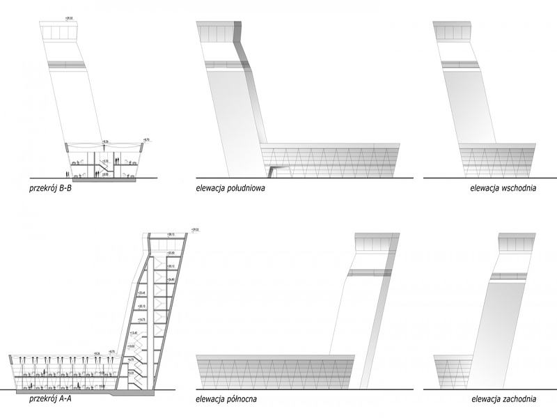 Smukły kształt trójkąta ostrokątnego będącego podstawowym elementem geometrii dachu podkreśla dynamikę budynku i związek jego formy z funkcją. Widoczna zarówno od wewnątrz, jak i z zewnątrz konstrukcja ma odgrywać decydującą rolę w odbiorze bryły budynku z ziemi i z powietrza. Dodatkowo do geometrii dachu nawiązuje ukształtowanie podziałów elewacji, jak i ukształtowanie całości układu w skali urbanistycznej.