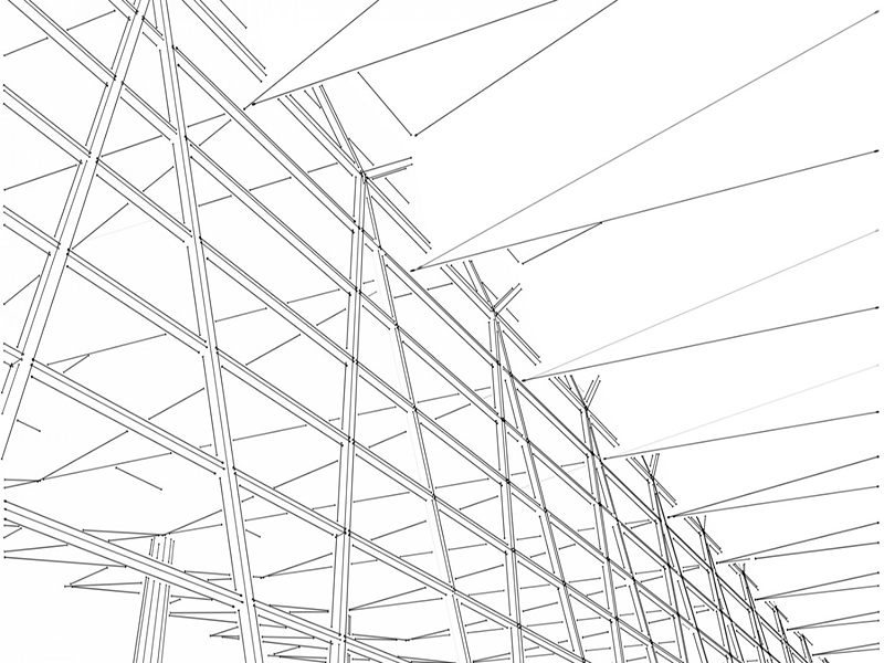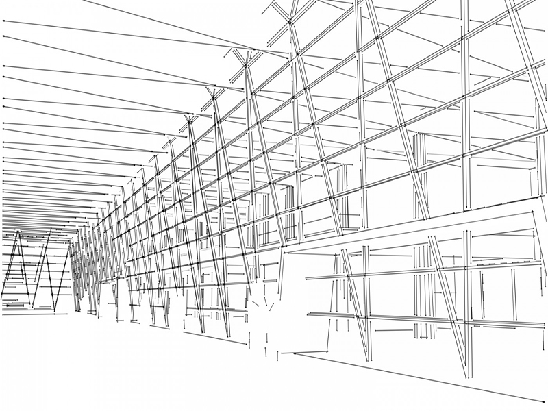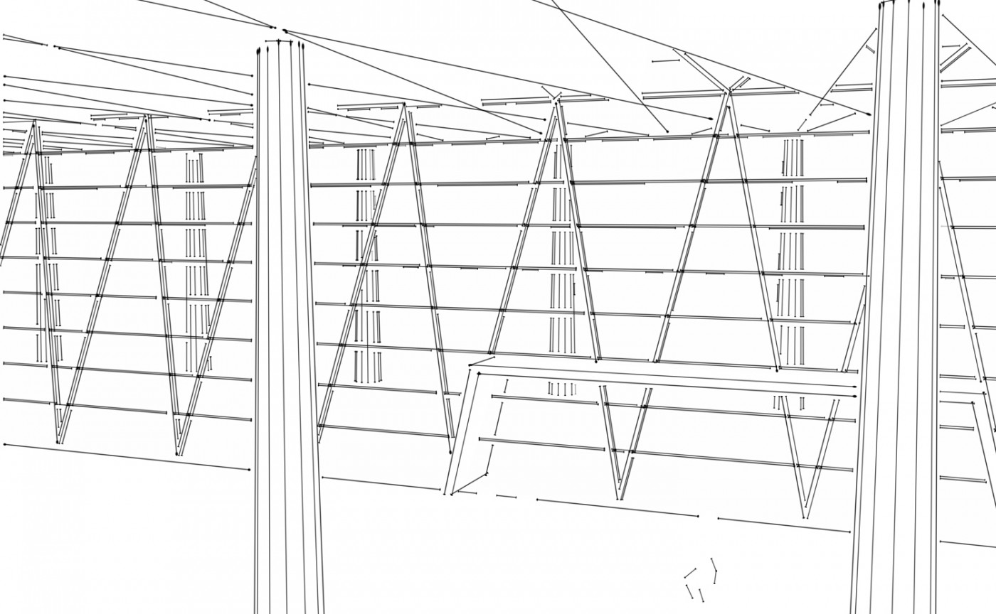 Ukształtowanie budynku oparte jest na prostej, powtarzalnej siatce osi przecinających się pod ostrym katem, która stanowi za razem główną siatkę konstrukcyjną budynku i siatkę konstrukcji dachu.