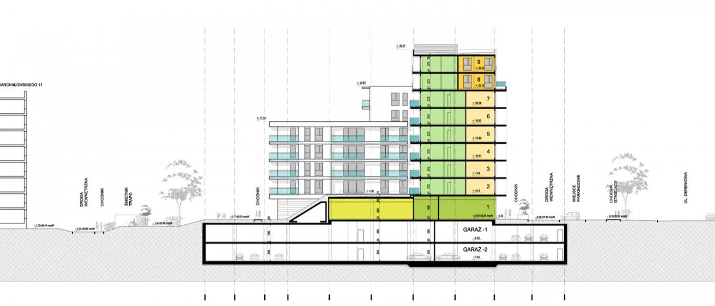 Budynek jest niejako kontynuacją inwestycji w zabudowę ulicy Dereniowej na warszawskim Ursynowie. Pracownia w ramach współpracy z lokalną spółdzielnią mieszkaniową wykonuje kolejną inwestycję o podobnej skali, funkcji oraz architekturze. Trzeci już budynek mieszkalny charakteryzuje się, jak poprzednie, wysoką jakością rozwiązań funkcjonalno-architektonicznych.