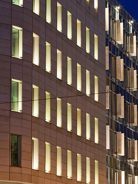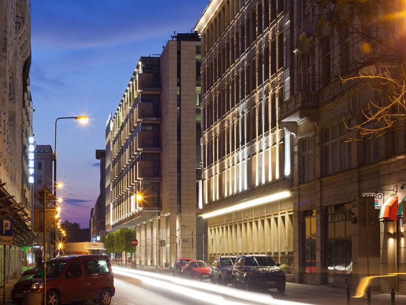 Siedmiokondygnacyjny budynek biurowy usytuowany na podłużnej, wysmukłej działce przy ul. Jasnej z niekorzystnie małym wymiarem jej krótszego boku. Nad chodnikiem ulicy Jasnej zaprojektowano 5-kond. nadwieszenie; natomiast od strony gmachu TVP budynek odsunięto na ok. 11m w celu uzyskania doświetlenia obu budynków. Od strony ul. Świętokrzyskiej w celu uzyskania ciągłości pierzei, budynek zbliża się na 4m do obiektu TVP w pełni przeszklonym łącznikiem z podwójną fasadą od strony północnej. W przestrzeni pomiędzy budynkami usytuowano wjazd do 4 kond. garażu podziemnego oraz pokryty drewnianym deckiem taras na poziomie terenu z donicami z zielenią wysoką. Uwypuklenie narożnikowego charakteru budynku przy skrzyżowaniu Jasnej i Świętokrzyskiej zrealizowano poprzez nawiązanie do kształtu narożnika Poczty Głównej. Budynek wykończono piaskowcem z elementami z trawertynu. Strefę przyziemia przeszklono, w celu uzyskania lekkości bryły.