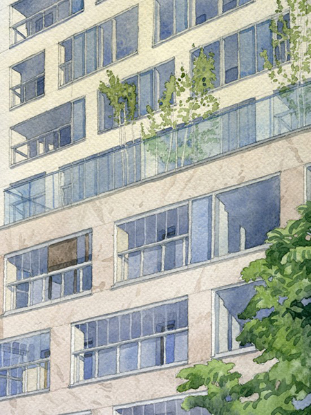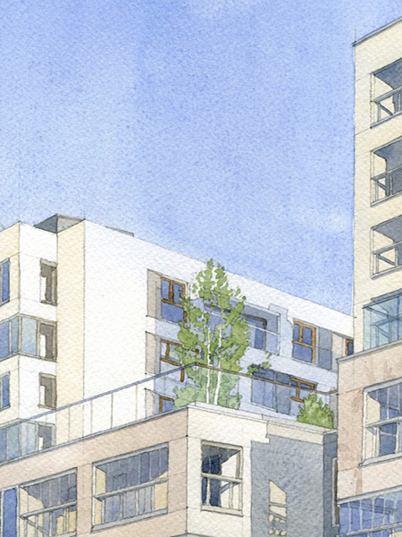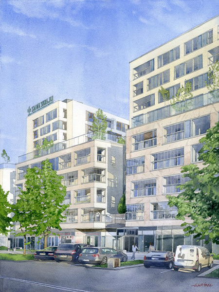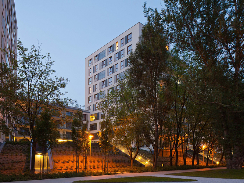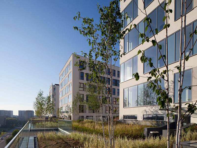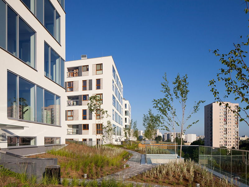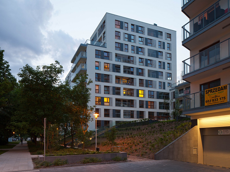 Obiekt nawiązuje gabarytami do sąsiedztwa. Bryła podzielona na dwa główne elementy – pierzejowy V kondygnacyjny oraz XI kondygnacyjne bryły prostopadłe do ulicy, otwarte na część południową. Ważnym elementem projektu są wykonane na poziomie +2 oraz +6 tarasy zielone, pozostawione do użytku mieszkańcom budynku.
