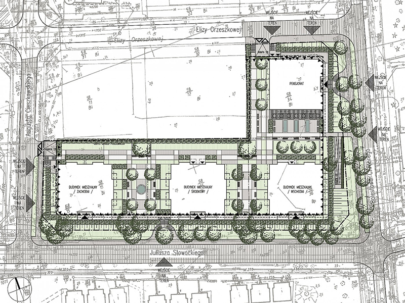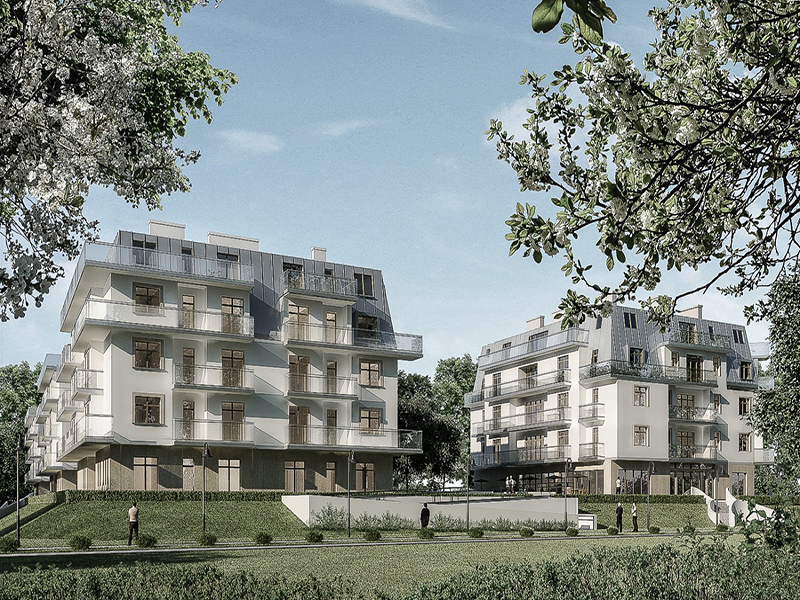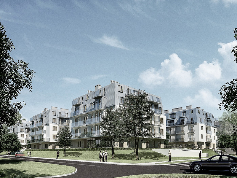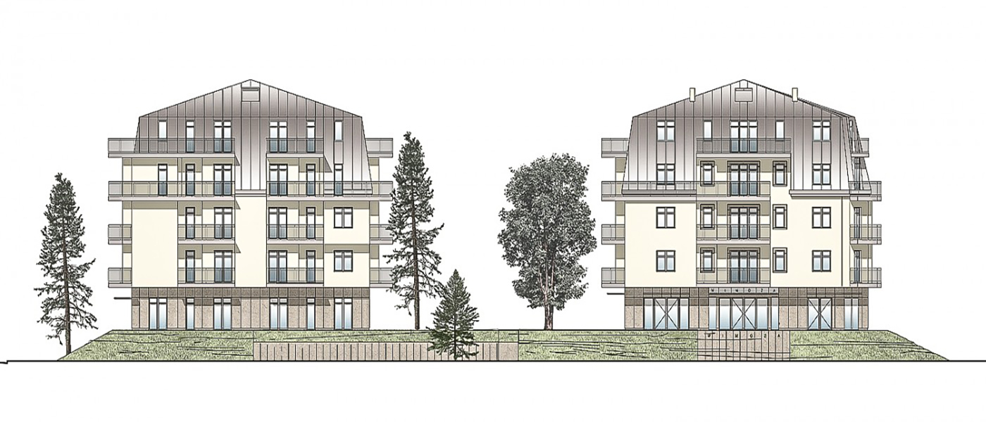 Projektowany zespół pensjonatów składa się z czterech budynków posadowionych na wspólnej kondygnacji garażu podziemnego. Wysokość budynku 18,5m. Zabudowa w formie budynków willowych wyniesionych na wspólnym garażu obsypanym skarpą ziemną z zielenią okrywowo-rekreacyjną.