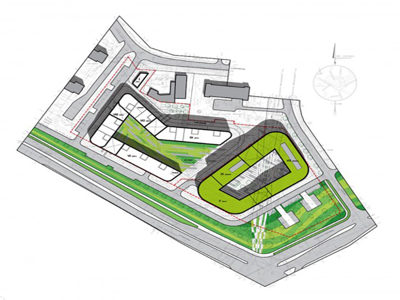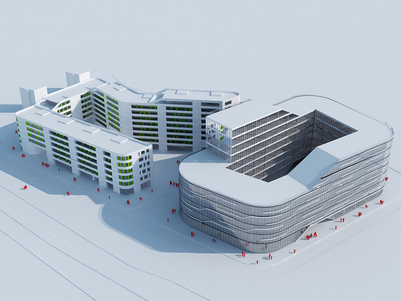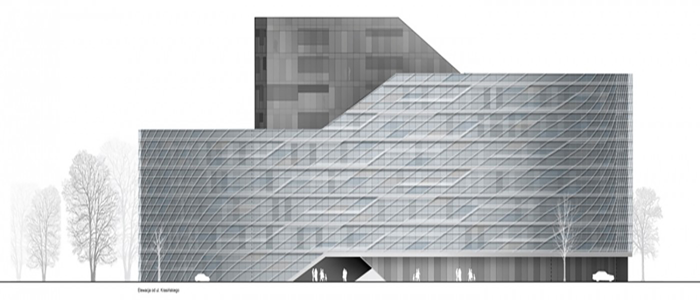 Budynek biurowy został zaplanowany jako nieregularny czworokąt, z wyoblonymi narożnikami, usytuowany wzdłuż obowiązkowych linii zabudowy od strony południowej, wschodniej i zachodniej, a od strony północnej wzdłuż granicy pomiędzy nieruchomościami A i B. Jego bryła narasta od wysokości 5 kondygnacji od strony zachodniej, do 7 od strony południowo-wschodniej do 9 od strony północnej. Ze względu na efektywność powierzchni biurowej wewnątrz budynku zaprojektowano dziedziniec, pozwalający doświetlić wewnętrzny trakt biurowy. Tektonika elewacji podąża za rozwiązaniami przestrzennymi: od strony zewnętrznej zaprojektowano podwójną fasadę, której zewnętrzna część, w postaci punktowo mocowanych tafli szklanych, każda w formie romboidalnego równoległoboku ukierunkowanego w stronę narastania brył, tworzy płaszczyznę podzieloną falistymi, tańczącymi, skierowanymi pod kątem w górę liniami. Całość uchwycono w mocne ramy poziomych linii wyznaczonych przez pas żaluzji ze szczotkowanej stali nierdzewnej, usytuowanych co kondygnację w linii stropów. Żaluzje te poza efektem estetycznym zapewniają wentylację podwójnej elewacji. Dodatkowym elementem zdobniczym w tej płaszczyźnie są umiejscowione w chaotycznej kompozycji elementy ze stali nierdzewnej wzmacniające krawędzie szklanych równoległoboków. Wewnętrzna część podwójnej fasady jest wykonana jako całkowicie przeszklona, w klasycznym podziale pionowo-poziomym: w pionie w module biurowym, z ryglami w strefie przystropowej. Całości kompozycji dopełnią wewnętrzne żaluzje w każdym module przeszklonym.