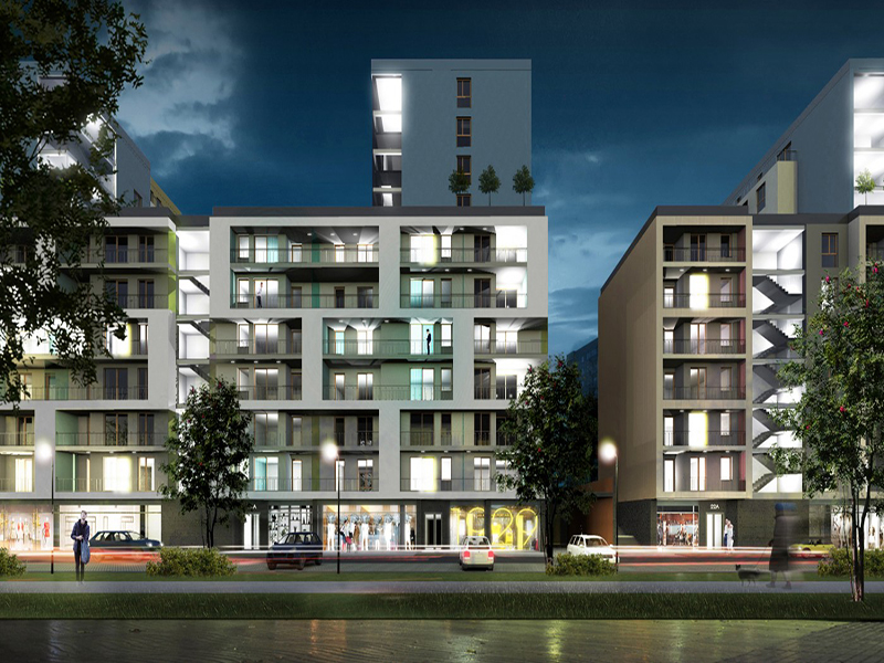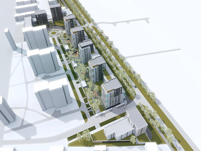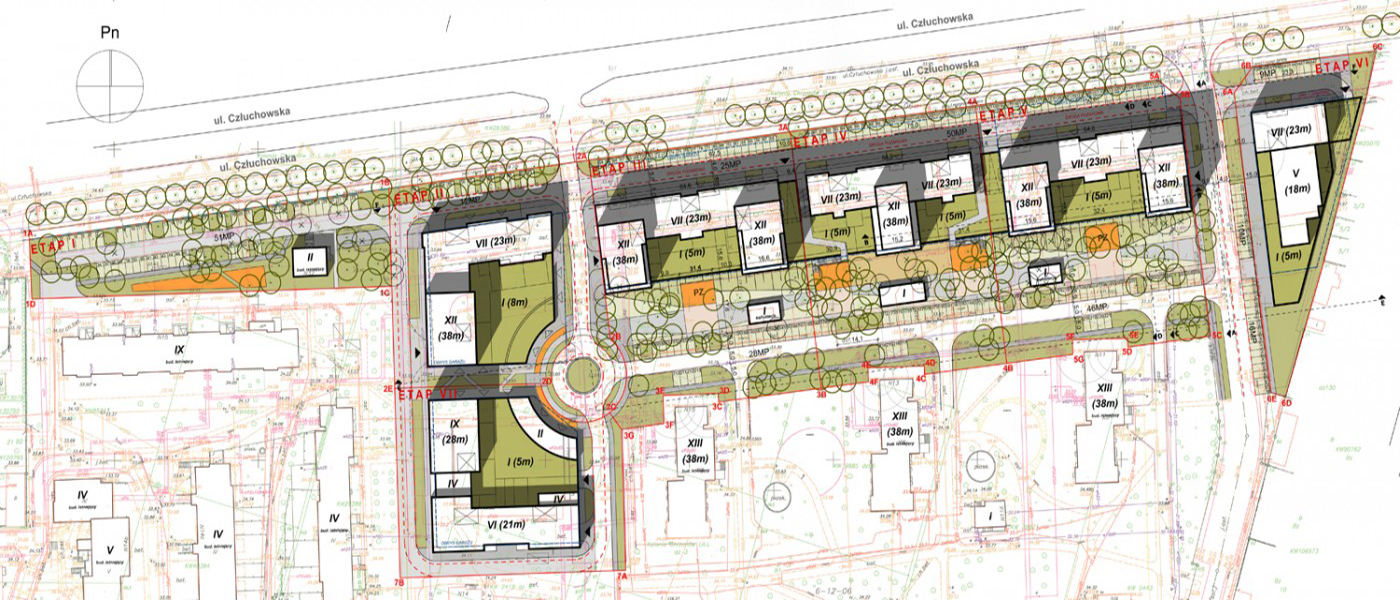 Koncepcja przedstawia zabudowę mieszkalno-usługową przy ulicy Człuchowskiej w Warszawie. Teren inwestycji został podzielony na etapy oraz zaprojektowany zgodnie z zasadą zrównoważonego rozwoju. Poszczególne etapy charakteryzują się spójną architekturą oraz konsekwentną urbanistyką. Od ulicy Człuchowskiej stworzono pierzeję zabudowy 7 kondygnacyjnej z usługami w parterach. Jest to swego rodzaju bufor pomiędzy ulicą, a wnętrzem osiedla rozłogi. Od południa zabudowa przybiera kształt grzebienia z wyższymi częściami nawiązującymi skalą do istniejących bloków mieszkalnych. Całość została spięta siatką komunikacji kołowej – wewnętrznej dla osiedla – niezależnej od ulicy Człuchowskiej. Najważniejszym założeniem zagospodarowania terenu jest jednak zielony pasaż zlokalizowany wzdłuż zabudowy od wnętrza osiedla.