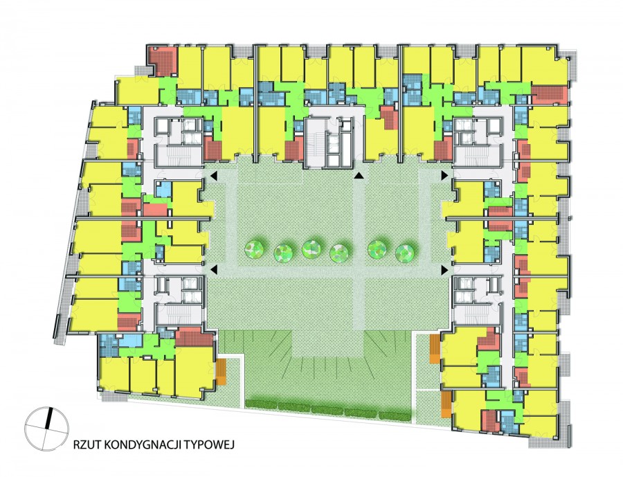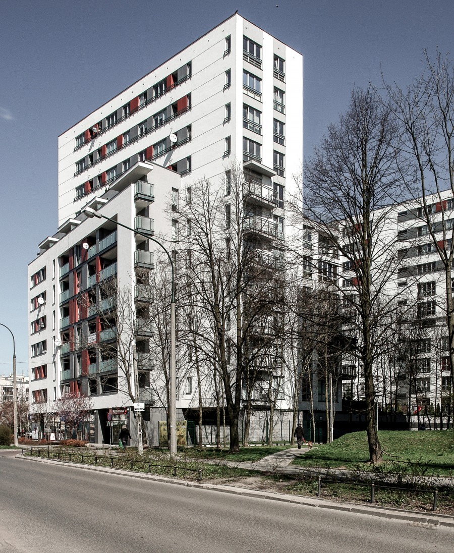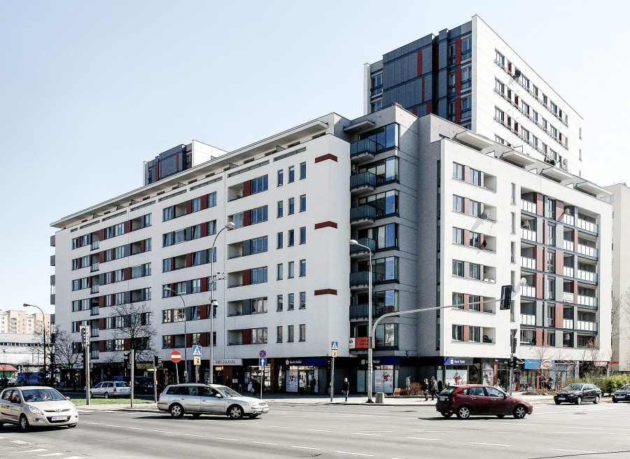 Bryła budynku została zaprojektowana na planie litery C otwierając się dziedzińcem z tarasami zielonymi w kierunku południowym. Jest to forma kilku brył wzajemnie się przenikających ze zróżnicowaną kolorystyką opartych na parterowym cokole, w którym znajdują się usługi. Wzdłuż ul. Człuchowskiej wysokość zabudowy wynosi VIII kondygnacji nadziemnych z wycofaniem kondygnacji najwyższej do linii podcienia w parterze, natomiast w częściach prostopadłych – XII kondygnacji ( nawiązując wysokością do istniejących bloków z lat 70-tych).