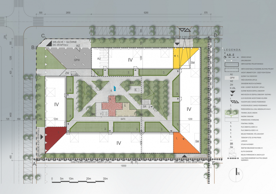 Otwarcie „do wewnątrz” stwarza poczucie bezpieczeństwa dla mieszkańców, które jest niezwykle istotnym elementem przyjaznego miejsca zamieszkiwania.Mały placyk wejściowy przy narożniku ulicy Korczaka, stanowi zapraszający urbanistyczny akcent, swoisty atraktor wiążący przestrzeńnowoprojektowanego założenia z istniejącym układem urbanistycznym. Jednocześnie jest to swoista brama wejściowa do strefy pieszej osiedla, która jest bocznym uzupełniającym ciągiem komunikacyjnym i kieruje ruch pieszy w kierunku dawnego przyszpitalnego parku. Plac główny stanowi główną przestrzeń publiczną założenia. Mimo iż przeprowadzony jest przez niego ruch kołowy, wyniesione skrzyżowanie a także uspokojony ruch zniesione są na obrzeża placu uwalniając przestrzeń dla pieszych. Na placu umiejscowiona lokalna dominanta w formie zegara, bądź obelisku